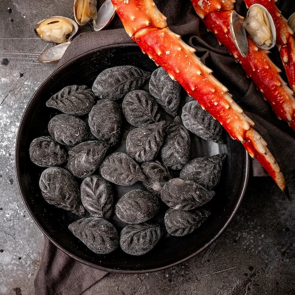 Яркая текстура теста с чернилами каракатицы Тесто с чернилами каракатицы не только выгодно выделяет пельмени в тарелке, но и добавляет тонкие солоноватые морские ноты. Чёрный цвет теста выглядит эффектно и дарит ощущение настоящего ресторанного блюда у вас дома.